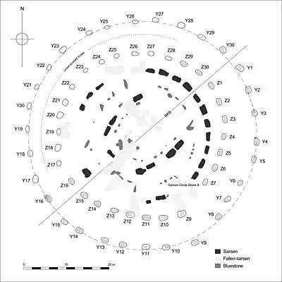 The Y and Z Holes are two rings of concentric (though irregular) circuits of 30 and 29 near-identical pits cut around the outside of the Sarsen Circle at Stonehenge. The current view is that both circuits are contemporary. Radiocarbon dating of antlers deliberately placed in hole Y 30 provided a date of around 1600 BCE, and a slightly earlier date was determined for material retrieved from Z 29.[1] These dates make the Y and Z holes the last known structural activity at Stonehenge.