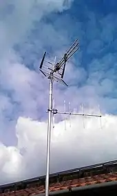 Also called a beam antenna[4] and parasitic array, the Yagi is very widely used as a directional antenna on the HF, VHF and UHF bands.[3][4] It has moderate to high gain of up to 20 dBi,[3] depending on the number of elements used, and a front-to-back ratio of up to 20 dB. It radiates linearly polarized[3] radio waves, and can be mounted for either horizontal or vertical polarization. It is relatively lightweight, inexpensive and simple to construct.[3] The bandwidth of a Yagi antenna, the frequency range over which it maintains its gain and feedpoint impedance, is narrow, just a few percent of the center frequency, decreasing for models with higher gain,[3][4] making it ideal for fixed-frequency applications. The largest and best-known use is as rooftop terrestrial television antennas,[3] but it is also used for point-to-point fixed communication links,[2] in radar antennas,[4] and for long distance shortwave communication by shortwave broadcasting stations and radio amateurs.[2]
