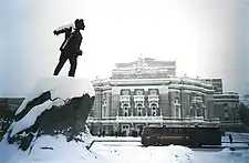 There are various theories on how he died and none can be proven officially such as poisoning, beating or flu. He is most commonly attributed to have died of either typhus or more likely the Spanish flu, after a political visit to the Ukraine and Oryol.[25][26] Kremlin doctors diagnosed him with the Spanish flu. Even as his illness progressed, he continued to perform his duties as chairman of the Central Committee. On 14 March 1919 Sverdlov lost consciousness and on the 16th he died at the age of 33.[27]