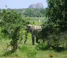 Yala National Park has a variety of ecosystems including moist monsoon forests, dry monsoon forests, semi deciduous forests, thorn forests, grasslands, marshes, marine wetlands, and sandy beaches.[3] The area under forest cover mainly consists of Block I and rangelands of open parkland (pelessa grasslands) including some extensive grasslands. The forest area is restricted to around the Menik River while rangelands are found towards the sea side. Other habitat types of the Block I are tanks and water holes, lagoons and mangroves and chena lands. The mangrove vegetation in the Buthuwa lagoon is largely Rhizophora mucronata while Avicennia spp. and Aegiceras spp. are less abundant. The vegetation of Block II is similar to those of Block I, and Yalawela, once a fertile paddy field, represents pitiya grasslands. The mangroves of Block II occur around the estuary of Menik River, which extend to 100 hectares (0.39 sq mi). The common mangrove plants are Rhizophora mucronata, Sonneratia caseolaris, Avicennia spp., and Aegiceras corniculatum. The lagoons of Pilinnawa, Mahapothana, and Pahalapothana are also located in this block.[3] The other common mangrove species are Acanthus ilicifolius, Excoecaria agallocha, and Lumnitzera racemosa. In the bare sand Crinum zeylanicum is found.[9]
