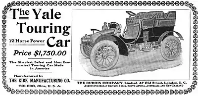 Kirk Manufacturing Company was a manufacturer of Brass Era automobiles in Toledo, Ohio from 1901 to 1905. Their automobile was marketed as the Yale.[2] It should not be confused with the Yale automobile made in Saginaw, Michigan from 1916 to 1918.