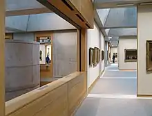 The center was established by a gift from Paul Mellon (Yale College Class of 1929) of his British art collection to Yale in 1966, together with an endowment for operations of the Center, and funds for a building to house the works of art. The building was designed by Louis I. Kahn and constructed at the corner of York and Chapel Streets in New Haven, across the street from one of Kahn's earliest buildings,[3] the Yale University Art Gallery, built in 1953. The Yale Center for British Art was completed after Kahn's death in 1974, and opened to the public on April 15, 1977. The exterior is made of matte steel and reflective glass; the interior is made of travertine marble, white oak, and Belgian linen. Kahn succeeded in creating intimate galleries where one can view objects in diffused natural light. He wanted to allow in as much daylight as possible, with artificial illumination used only on dark days or in the evening. The building's design, materials, and sky-lit rooms combine to provide an environment for the works of art that is simple and dignified.[4]
