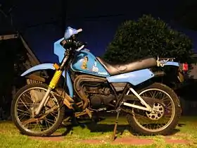 The Yamaha DT50MX is the most common 50 cc (3.1 cu in) motorcycle in the Yamaha DT series. It superseded the DT50M when introduced in June 1981 and can easily be identified by its Mono-Cross(MX) rear suspension with a silver painted square-section rear swinging arm and a more angular tank as opposed to the more rounded one found on the M variant. The 'MX' designation was commonly used on Yamaha motorcycles fitted with the 'Mono-Cross' rear suspension, which was the first to employ a single shock-absorber. It remained in production largely unchanged until 1996, gaining only a CDI ignition system and a change to square bodied direction indicator lights in 1986 with the introduction of the 2FN model (sometimes referred to as the MX-S). The moped is very common in Scandinavia where its leading competitor was the Honda MT50 and can be ridden on a CBT at 16 in the UK.