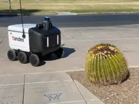 In November 2019, the company presented its autonomous delivery robot, based on the same self-driving technology the company is using for its autonomous cars. The robot is the size of a suitcase and navigates sidewalks at the speed of 5-8kph. As part of the initial testing phase, robots were operating on the Yandex 7,000 employees campus in Moscow, transporting small packages from one building to another.[21]