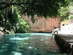 Due to underground geothermal activity, Yankari National Park also features four warm water springs. The camp is named after the most well known of these, the Wikki Spring, from the local Duguri language with “Wikki” meaning “where are you?”. The Wikki Warm Spring is the largest spring and is about 13.0 metres wide and 1.9 metres deep. It daily flows 21,000,000 litres of clear, spring water into the Gaji river.[14] The spring has a constant temperature of 31.1 °C throughout the year during both day and night and has been developed for recreation.