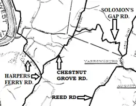 Yarrowsburg sits at the foot of Elk Ridge mountain on the west side of Pleasant Valley, stretching along Reed, Kaetzel and Yarrowsburg roads in southeastern Washington County. Until the late 19th century, Elk Ridge was wholly owned by the Antietam Iron Works. The forest was used as fuel for the furnace and forges after being converted to charcoal. After being harvested and especially after the iron works went bankrupt in the 1850s, the mountain land was sold off in multi-acre lots. Many of the properties in Yarrowsburg are on former iron works property. The village is named for Aquila and Polly Yarrow, free African Americans who bought a small log house on 1 1/4 acres of land in the southeast corner of Yarrowsburg and Reed roads in 1825. The Yarrows were one of several free black families living in Yarrowsburg at the time. It is thought that Aquila worked as a collier for the iron works.[4] Aquila died unexpectedly in 1832, but Polly lived at the village named for her until November 21, 1885. This was also the site of the only (historical) crossing of Elk Ridge mountain through the steep and rocky Solomon's Gap. Elk Ridge can only be passed otherwise by circling around its north or south ends via Trego or Sandy Hook roads. The road through Solomon's Gap was abandoned in the early 20th century and is no longer a through road. Solomon's Gap would play a role in the strategy of the Civil War battles in the area.[5] Yarrowsburg is today a rural village of single-family homes.