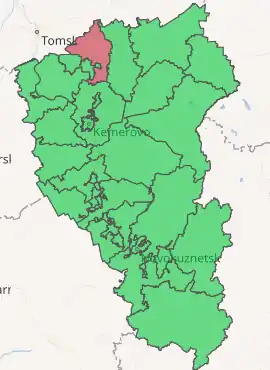 Yaysky District (Russian: Яйский райо́н) is an administrative district (raion), one of the nineteen in Kemerovo Oblast, Russia.[1] As a municipal division, it is incorporated as Yaysky Municipal District.[6] It is located in the north of the oblast. The area of the district is 2,669 square kilometers (1,031 sq mi).[2] Its administrative center is the urban locality (an urban-type settlement) of Yaya.[1] Population: 20,383 (2010 Census);[3] 24,982 (2002 Census);[8] 26,759 (1989 Census).[9] The population of Yaya accounts for 57.3% of the district's total population.[3]