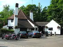 The building, in its current location, was originally known as The Round House[6] but there is no record of it being licensed as a public house under that name. The first known reference to it being an alehouse is in 1756 when it appears to be trading as The Three Pigeons. Around 1800 its name changed to the Fighting Cocks, perhaps in reference to the sport of cock fighting which was popular at the time and which may have taken place in the main bar area. The prefix "Ye olde..." is a late Victorian affectation. It is known by locals as 'The Fighters' or 'The Cocks'.[7]