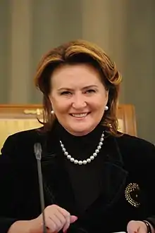 In November 2008, she was elected to Supreme Council of Russian political party United Russia. On 12 March 2009, Prime Minister Vladimir Putin appointed Skrynnik minister of agriculture of the Russian Federation. Her tenure ended in 2012 when she was removed from office due to her alleged involvement in nepotism and illegal activities to raise her wealth.[5] Skrynnik was not included in the new Russian government in 2012, for she was on maternity leave. Allegations of possible corruption connections were refuted by the report of the Accounting Chamber, according to which the lessees debt in 2008 amounted to 1 billion rubles and not 39 billion rubles, as the media claimed. The corruption component has not been found by the auditors of Accounting Chamber.[6] In an interview with TASS Skrynnik announced her intention to sue the journalists.[7] According to some analysts, an inquiry of Skrynnik activities can be explained as an intra-elite struggle presented under the guise of the fight against corruption.[8][9][10] Skrynnik, heading the state-owned company, was not a government official and was not related to the civil service category, so she did not commit any violations, considers a FBK partner Igor Nikolaev.[11] Experts do not rule out that the problems could appear because of Skrynnik disagreements with Viktor Zubkov. Skrynnik could face administration friction with the first vice-premier in charge of agriculture, since he was interested to be the closing link of the chain in all agricultural policy matters. "Zubkov was meant to respond hard to violations of Rosagroleasing in any case,- said Yevgeny Minchenko from the Institute of Political Expertise: "To turn away a blow, as he led the company's board of directors".[11]