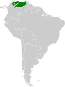 The yellow-knobbed curassow is found in northern Venezuela as far east as Sucre and Monagas states and in immediately adjacent northeastern Colombia. It primarily inhabits gallery forest and tall scrub in the llanos. It also occurs in valleys and ravines in the nearby foothills. In elevation it ranges between 500 and 1,500 m (1,600 and 4,900 ft) in Colombia and 100 and 800 m (330 and 2,600 ft) in Venezuela.[3]