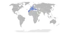 The breeding range is centred on the Mediterranean Sea. In North Africa it is common in Morocco, Algeria and Tunisia and increasing in places. Recent breeding has occurred in Libya and Egypt. In the Middle East, a few breed in Israel and Syria with larger numbers in Cyprus and Turkey. In Europe there are colonies all along the Mediterranean coast, and also on the Atlantic islands and coasts north to Brittany and west to the Azores. It also breeds on the western side of the Black Sea; here it overlaps with the Caspian gull but there is a difference in habitat, with the yellow-legged gull preferring sea cliffs and the Caspian gull flatter shores. In recent decades birds have spread north into central and western Europe. One to four pairs have attempted to breed in southern England since 1995 (sometimes hybrid pairs with lesser black-backed gulls), though colonisation has been very slow.[8]