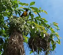 It is a colonial breeder, with up to 100 bag-shaped nests in a tree, which usually also contains an active wasp nest. The females build the nests, incubate, and care for the young. Each nest is 30–45 cm long and widens at the base, and is suspended from the end of a branch. Females compete for the best sites near the protection of the wasp nest. The normal clutch is two dark-blotched pale blue or white eggs. Females begin incubating after laying the second egg; hatching occurs after 13 or 14 days. The young fledge in 34 to 40 days, usually only one per nest.
