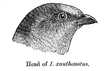 The yellow-rumped honeyguide (Indicator xanthonotus) is a sparrow-sized bird in the honeyguide family that is found in Asia, mainly in montane forests along the Himalayas. They are very finch-like but the feet are strong and zygodactyl, with two toes facing forward and two backward. They perch on honeycombs and feed on wax. Males tend to be territorial and stay near honeycombs while females and juveniles forage widely. They are brood parasites, laying their eggs in the nests of tree-hole breeders, possibly barbets.