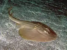 The yellow-spotted fanray was described by Y. Iwatsuki, J. Zhang and K. Nakaya in 2011 as one of the three species in the genus Platyrhina. It is classified in the genus due to the patches of yellow on its central disc and thorns close to its orbit.[1] Its specific name tangi is named after D.-S. Tang, a Chinese ichthyologist.[2] Its holotype is located in Miyazaki, Japan.[3] The species' closest relative is Platyrhina hyugaensis, the Hyuga fanray, due to the similarity of the two rays' thorn patterns.[1]