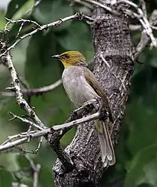 The yellow-throated bulbul (Pycnonotus xantholaemus) is a species of songbird in the bulbul family of passerine birds. The species is endemic to southern peninsular India. They are found on scrub habitats on steep, rocky hills many of which are threatened by granite quarrying. It is confusable only with the white-browed bulbul with which its range overlaps but is distinctively yellow on the head and throat apart from the yellow vent. The calls of this species are very similar to that of the white-browed bulbul.