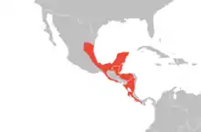 The yellow-throated euphonia has a northern range limit in eastern Mexico of southern Tamaulipas, eastern San Luis Potosí, northeastern Puebla (east of Huauchinango), and northern Veracruz south to Tuxpan and Tlapacoyan.[10] Its range extends south into Belize, Honduras, El Salvador, eastern Nicaragua, Costa Rica, and western Panama.[14] E. h. gnatho is found in northeastern Nicaragua, Costa Rica (absent in southwest and Caribbean lowlands), and extreme Western Panama.[14] It is found mainly in dry to humid regions along forest borders, second growth, shady plantations, and medium-height thick growing woods along river gorges and streams.[15] Occurs from lowlands to 2100 m in Mexico and primarily in plateau and hill country in El Salvador and Costa Rica. Presumed to reside in foothills between 900 m and 1200 m elevation in western Panama.[2] Resident over most of range with some local seasonal movement in response to food availability.[2] In Mexico it is considered likely only a non-breeding visitor from October to May on the Pacific slope of Isthmus of Tehuantepec in Oaxaca.[2] Found to be present in El Salvador only during the spring and summer months, so possible that it is migratory.[15]