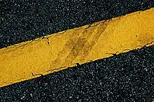 A yellow line (solid or dashed) indicates that crossing the line will place a driver in a lane where opposing traffic is coming at the driver. A double yellow line is a painted marking separating two lanes of a road. It consists of two parallel, solid yellow lines, and its presence indicates a two-direction no-passing restriction or no passing zone, where traffic in both directions is strictly prohibited from crossing the line to pass other traffic.[11] Some states, like California, paint a black line down the middle to help drivers see the double yellow line. Where such a marking is present and one vehicle comes up behind another, the faster vehicle cannot cross the double yellow line to overtake the slower vehicle, must match its speed, and must follow the slower vehicle until they reach a passing zone or the slower vehicle turns off the road. There are four major exceptions to the rule against crossing a double yellow line: (1) turning left into a side street or driveway; (2) passing bicyclists or pedestrians (where they are obstructing through traffic on roads lacking a shoulder and/or a bike lane); (3) emergency maneuvers; and (4) temporary traffic flow changes due to road work. As with regular passing zones, opposing traffic always has right of way.