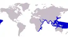The yellowtail scad is widely distributed in the tropical and subtropical regions of the Indo-Pacific region.[4] In the Indian Ocean, the species is known from as far south as South Africa, distributed north along the east African coast including Madagascar, and further north to the Persian Gulf, Red Sea, India, Sri Lanka and Southeast Asia.[10] In the Pacific, the species is most prevalent in Southeast Asia, Indonesia, Philippines, extending southward to northern Australia, north to Japan, where only three specimens have been recorded,[11] and as far east as Hawaii.[10]