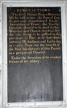 Benefactions. The Revd Thomas Hooper Morrison left by will in 1824 the sum of £100 £3 per cent. Consolidated Bank Annuities in trust, the yearly interest thereof to be paid to the Minister and Church-Wardens for the time being to be applied in the purchase of fuel to be distributed between Michaelmas and Lady Day in every year for the benefit of the poor inhabitants of this parish as a perpetual charity. Under the directions of the resident owner of the Abbey