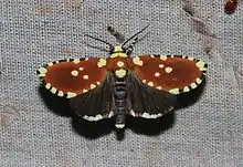 The species is described as: wingspan of the male is about 24 mm and the female 30 mm. Head and thorax bright ferrous colour. Vertex of head, collar and metathorax with some sulphur-yellowish patches. Abdomen black with narrow white rings, and a white anal tuft. Forewings also ferrous with a yellow patch. There is a series of costal specks and a medial series of spots consisting of a large costal spot, two spots towards the inner margin, and two small spots at the middle. A series of large marginal and cilial spots and two specks can be seen on inner margin. Hindwings black, with a series of white cilial spots. Ventral side variegated with white.[4]