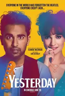 Yesterday is a 2019 romantic comedy film directed by Danny Boyle and screenplay by Richard Curtis, based on a story by Jack Barth and Curtis. Himesh Patel stars as struggling musician Jack Malik, who suddenly finds himself the only person who has ever heard of the Beatles and becomes famous after reintroducing their songs to the world. The film also stars Lily James, Joel Fry, Ed Sheeran, and Kate McKinnon. It gets its title from the 1965 Beatles song of the same name.