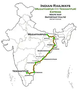 The Yesvantpur–Muzaffarpur Weekly Express is an Express train belonging to East Central Railway zone that runs between Yesvantpur Junction and Muzaffarpur Junction in India. It is currently being operated with 15227/15228 train numbers on a weekly basis.[1][2][3][4]