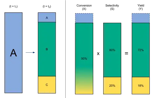 In chemistry, yield, also referred to as reaction yield, is a measure of the quantity of moles of a product formed in relation to the reactant consumed, obtained in a chemical reaction, usually expressed as a percentage. [1] Yield is one of the primary factors that scientists must consider in organic and inorganic chemical synthesis processes.[2] In chemical reaction engineering, "yield", "conversion" and "selectivity" are terms used to describe ratios of how much of a reactant was consumed (conversion), how much desired product was formed (yield) in relation to the undesired product (selectivity), represented as X, Y, and S.