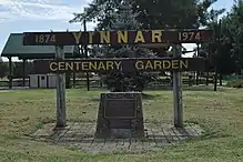 The Centenary Gardens located in Main Street, Yinnar were officially opened by William C. Welsh ESQ. J.P. on 10 March 1974 to commemorate the centenary of the arrival of the first settlers in the Yinnar district. The Centenary Garden includes the Railway Goods Shed, play equipment, picnic tables, barbecue area, information and public toilets.