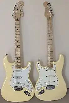 Malmsteen has been a longtime user of Fender Stratocasters with DiMarzio HS3 single-coil pickups "for playing at blistering volume with no hum or screechiness".[27] His most famous Stratocaster is his 1972 blonde Stratocaster, nicknamed "The Duck" because of its yellow finish and the Donald Duck stickers on the headstock. An alternative nickname for this guitar is "Play Loud" due to a sticker that Anders Johansson put on the upper horn of the guitar in Rockshire studios in 1984. Fender made 100 replica copies of this guitar and marketed it as the "Play Loud Guitar". He also has a Fender Yngwie Malmsteen Signature Stratocaster since 1986.[28] It comes in a Vintage White finish with a maple neck, either a maple or rosewood fretboard with scalloped frets and, from 2010, Seymour Duncan STK-S10 YJM "Fury" Model pickups. There is also a signature YJM100 Marshall amplifier, based on the "1959" amplifier range.