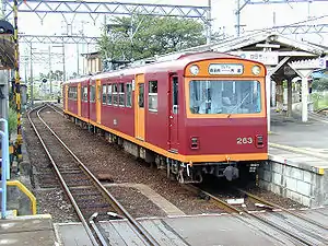The line was originally built as a tram utilising a track gauge of 762mm, which was relatively common at that time for such local lines. Later on the legal classification of the line was changed from a tram to a light rail, however the gauge was not widened, unlike the majority of 762mm gauge lines. Today, there are only four 762 mm (2 ft 6 in) gauge railway lines in operation in Japan.