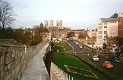 ![]() View of the city, looking north-east from the city wall, near the railway station. The brown spire at left in the middle distance is the Oratory Church of Saint Wilfrid, and the three towers of York Minster are visible behind | |