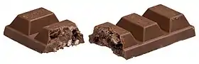 Yorkie bars were originally composed of six chunks of chocolate each marked Rowntree; they were wrapped in both foil and an outer paper wrapper and weighed 58 g (2.0 oz).[12][13] The wrapping was later switched to a single plastic foil wrapper. More recently, in an effort to reduce costs, the number of chunks has been reduced to five with "Yorkie" moulded into each chunk. The weight of the bar has decreased over the years. In 2002, Yorkie bars were 70 g (2.5 oz).[14] This had been reduced to 64.5 g (2.28 oz) by 2010, and was reduced further to 61 g (2.2 oz) in 2011 and then 55 g (1.9 oz) later that year. It was shrunk again in November 2014 to 46 g (1.6 oz). In January 2015, UK, Raisin & Biscuit Yorkies were 44 g (1.6 oz). Limited edition Yorkie Peanut was 43 g (1.5 oz). Yorkie King size bars have also reduced in size.[14]