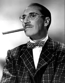 You Bet Your Life is an American comedy quiz series that aired on both radio and television.[1] The original and best-known version was hosted by Groucho Marx of the Marx Brothers, with announcer and assistant George Fenneman. The show debuted on ABC Radio on October 27, 1947, then moved to CBS Radio debuting October 5, 1949, before making the transition to NBC-TV and NBC Radio on October 4, 1950. Because of its simple format, it was possible to broadcast the show on both radio and television but not simultaneously. Because many of the laughs on the television show were evoked by Groucho's facial reactions and other visual gimmicks, the two versions were slightly different. The last episode in its radio format aired on June 10, 1960. On television, however, the series continued for another year, debuting in its final season on September 22, 1960, and with a new title, The Groucho Show.