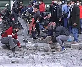 The party chairman had given approval to table MCC while several fellow politicians stood in opposition to the chairman's decision. They called for protests even on streets. Many police were attacked. Trees were broken, the blocks of footpath were removed to attack police as shown in picture. The branches of trees were broken.[12] The Maoist cadets destroyed a boutique while the owner was saving police.[13] Government had to pay for the loss. Leader of opposition and chairman of Communist Party of Nepal (Unified Marxist–Leninist), KP Sharma Oli of condemned the decision of Maoists to stay in government while destroying public property at the same time.[14] The Home Minister of Nepal, Bal Krishna Khan's and Prime minister asked the protesters to stay calm and not destroy public properties casing loss to the government and economy.[15]
