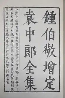Yuan Hongdao (Chinese: 袁宏道; pinyin: Yuán Hóngdào; Wade–Giles: Yüan Hung-tao, 1568–1610) was a Chinese poet of the Ming Dynasty, and one of the Three Yuan Brothers, along with his brothers Yuan Zongdao and Yuan Zhongdao. Hongdao's life spanned nearly the whole of the Wanli period (1573-1620) in Chinese history. A native of Gong'an in Hukuang, his family had been military officials for generations. Hongdao showed an interest in literature from youth and formed his own literary club at age fifteen. At the age of twenty-four in 1592 he took the jinshi examination and subsequently received an official position in 1595. However he quit out of boredom after a year. He traveled and consulted with the radical philosopher Li Zhi. On another trip his brothers joined him. Hu's elder brother was a Buddhist-Confucianist synchronist. His travels resulted in his publishing a poetry compilation Jietuo ji [Collection of One Released]. His and his two brothers' poetry, which focused on clarity and sincerity, produced a following eventually known as the Gong'an school, the central belief of which was that good writing was a result of genuine emotions and personal experience. When his elder brother Zongdao died in 1600, Hongdao retired to a small island in a lake to meditate and write poetry. The resulting work is Xiaobi tangji [Jade-Green Bamboo Hall Collection].