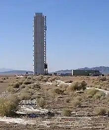 As part of Operation Tinderbox, on June 24, 1980, a small satellite prototype (DSCS III) was subjected to radioactivity from the "Huron King" shot in a vertical line-of-sight (VLOS) test undertaken in Area 3. This was a program to improve the database on nuclear hardening design techniques for defense satellites. The VLOS test configuration involved placing a nuclear device (less than 20 kilotons) at the bottom of a shaft. A communications satellite or other experiment was placed in a partially evacuated test chamber simulating a space environment. The test chamber was parked at ground level at the top of the shaft. At zero time, the radiation from the device shot up the vertical pipe to the surface test chamber. Mechanical closures then intercepted and sealed the pipe, preventing the explosive shock wave from damaging the targets. The test chamber was immediately disconnected by remote control from the pipe and quickly winched to safety before the ground could subside to form a crater. The Huron King test cost US$10.3 million in 1980 (equivalent to $33.9 million today).[18]