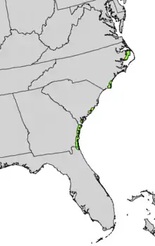 Yucca gloriosa grows on exposed sand dunes along the coast and barrier islands of the subtropical southeastern USA, often together with Yucca aloifolia and a variety formerly called Yucca recurvifolia or Y. gloriosa var. recurvifolia, now Y. gloriosa var. tristis.[8] In contrast to Y. gloriosa var. tristis, the leaves of Y. gloriosa var. gloriosa are hard stiff, erect and narrower. On the other hand, Y. aloifolia has leaves with denticulate margins and a sharp-pointed, terminal spine.
