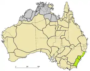 ![]() Yuin–Kuric languages (green) among other Pama–Nyungan (tan). From southwest to northeast, the three groups are Yuin, Yora, and Kuri. | |