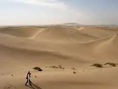 According to the Book of Wei, after having matured (when at least 30-year-old) or because of his strength,[14] Mugulü was emancipated; then became a warrior in the Tuoba Xianbei cavalry, under the leadership of Tuoba Yilu of Dai (307–316), son of Tuoba Shamohan, who was head of the Tuoba clan, Duke of Dai, and later, Prince of Dai, being the founder of this Xianbei kingdom.[15] However, he tarried past the deadline and was sentenced to death by beheading.[16] He vanished and hid amidst the Wide Desert's ravines and valleys for a time[17][18] gathered and united up to and over one hundred of escapees.[19] The escapees sought refuge under a Gaoche (Tiele) neighboring tribe[17][18] called Hetulin (紇突隣).[20][21][22][23] Later the Gaoche themselves would become enemies of the Rouran nation with the self-proclamation of Afuzhiluo king of the Gaoche.
