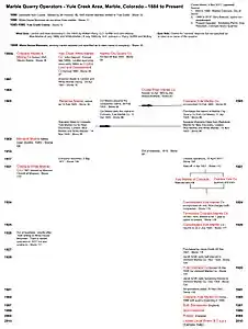5. Chart on right: "Marble Quarries Operators – Yule Creek Area, Marble, Colorado – 1884 to Present"; by Charles Moore, Museum Director, Marble Historical Society, Marble, Colorado: City of Stone, Vandenbusche, Duane and Myers, Rex; Golden Bell Press, Denver, Colorado; February 1996, 6th printing
