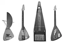 - The blue 4 string supertremolo-guitar, with no fretboard, but an adjustable pitch control for the left hand.
