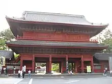 The 21 meter (69 foot) two-storied main gate, Sangedatsumon (三解脱門) was constructed in 1622,[8] and it is therefore the oldest wooden building in Tokyo.[9] The temple's only original structure to survive the Second World War,[10] it has been designated an Important Cultural Property.