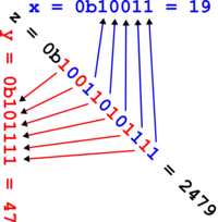 The figure below shows the Z-values for the two dimensional case with integer coordinates 0 ≤ x ≤ 7, 0 ≤ y ≤ 7 (shown both in decimal and binary). Interleaving the binary coordinate values (starting to the right with the x-bit (in blue) and alternating to the left with the y-bit (in red)) yields the binary z-values (tilted by 45° as shown). Connecting the z-values in their numerical order produces the recursively Z-shaped curve. Two-dimensional Z-values are also called as quadkey ones.