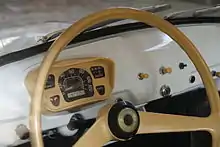 In 1979, the 968 series was replaced by the modernized 968M.[13] Prototyped in 1977, it had the "ears" removed and replaced much of the chrome exterior with black plastic.[13] Its interior design was also upgraded, featuring a closed-space glove compartment and a slightly more modern dashboard. It was offered with either the MeMZ 968E (40 hp (30 kW; 41 PS), carbureted, low-compression for 76-octane fuel); 968GE (40 hp (30 kW; 41 PS), dual carburettor); or the MeMZ 968BE (50 hp (37 kW; 51 PS), 8.4:1 compression, for 93-octane).[13] Instead of the side-mounted "ears", the hood lid and rear quarter panels were louvered.[17]