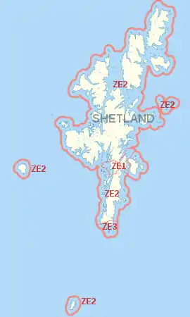 The ZE postcode area, also known as the Lerwick postcode area,[2] is a group of three postcode districts covering the Shetland Islands in Scotland. The letters in the postcode are derived from Zetland, the name for the council area until 1975.