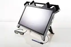 The zSpace system uses a 1920 x 1080 pixel LCD screen, and the hardware switches between the left and right images through a circularly polarized light that enters the eye.[28] The glasses contain small reflective tabs that the computer uses to track where users are looking.[29] This software prevents nausea and headaches by keeping the image focused.[30][31]