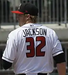 He then attended the University of Arkansas, where he played three seasons for the Arkansas Razorbacks. In his freshman season, Jackson posted a 2.53 ERA and 42 strikeouts in 422⁄3 innings.[2] Jackson made 27 relief appearances as a sophomore in 2015, and went 5–1 with a 2.10 ERA, 89 strikeouts, and nine saves in 60 innings pitched. His performance earned him a spot on the All-SEC First Team, as well as a position on the Collegiate National Team.[2] In his final year with the Razorbacks, Jackson pitched as both a starter and reliever, and posted a 3–4 record with a 5.09 ERA, 66 strikeouts, and four saves.[2]