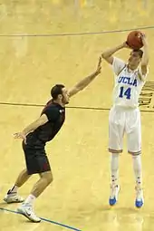 After a strong start to 2013–14 as the team's sixth man, featuring an impressive display of outside shooting and explosive dunks, the former point guard LaVine evoked memories of former Bruin Russell Westbrook's UCLA beginnings.[5] NBA draft pundits began ranking LaVine high on their projections for the 2014 NBA draft if he declared himself eligible.[5][12] ESPN.com draft expert Chad Ford attributed LaVine's appeal to the Westbrook comparisons. At one point, Ford listed him as the 10th overall pick, while NBADraft.net ranked him fifth.[5] During the season, LaVine typically entered the game with coach Alford's freshman son, Bryce Alford, who usually handled the ball, while starter Kyle Anderson was the team's main facilitator.[5][13] During a six-game span beginning on January 26, 2014, LaVine endured a shooting slump where he made just 7 of 36 shots from the field.[11] He averaged 9.4 points per game during the season, fourth best on the team, and his 48 three-point field goals made were the second most by a freshman in the school's history.[14] However, LaVine did not reach double-figures in scoring in 14 of the final 18 games,[15] and totaled just 11 points and was 0 for 8 on three-point attempts in the final five games.[16] Despite his late-season struggles, he was voted to the Pac-12 All-Freshman Team,[17][18] and he was named with Bryce Alford as the team's most valuable freshmen.[14]