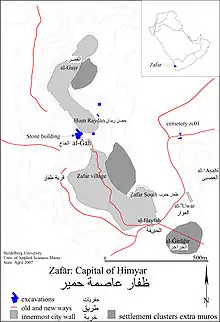 Ẓafār or Dhafar (Arabic: ظفار) is an ancient Himyarite site situated in Yemen, some 130 km south-south-east of today's capital, Sana'a, and c. 10 kilometres (6.2 mi) southeast of Yarim. Given mention in several ancient texts, there is little doubt about the pronunciation of the name.[2] Despite the opinion of local patriots in Oman, this site in Yemen is far older than its namesake there.[3] It lies in the Yemeni highlands at some 2800 m. Zafar was the capital of the Himyarites (110 BCE - 525 CE), which at its peak ruled most of the Arabian Peninsula.[4] For 250 years the tribal confederacy and allies' combined territory extended past Riyadh to the north and the Euphrates to the north-east.