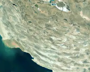 The Zagros fold and thrust belt (Zagros FTB) is an approximately 1,800-kilometre (1,100 mi) long zone of deformed crustal rocks, formed in the foreland of the collision between the Arabian Plate and the Eurasian Plate. It is host to one of the world's largest petroleum provinces, containing about 49% of the established hydrocarbon reserves in fold and thrust belts (FTBs) and about 7% of all reserves globally.[1]